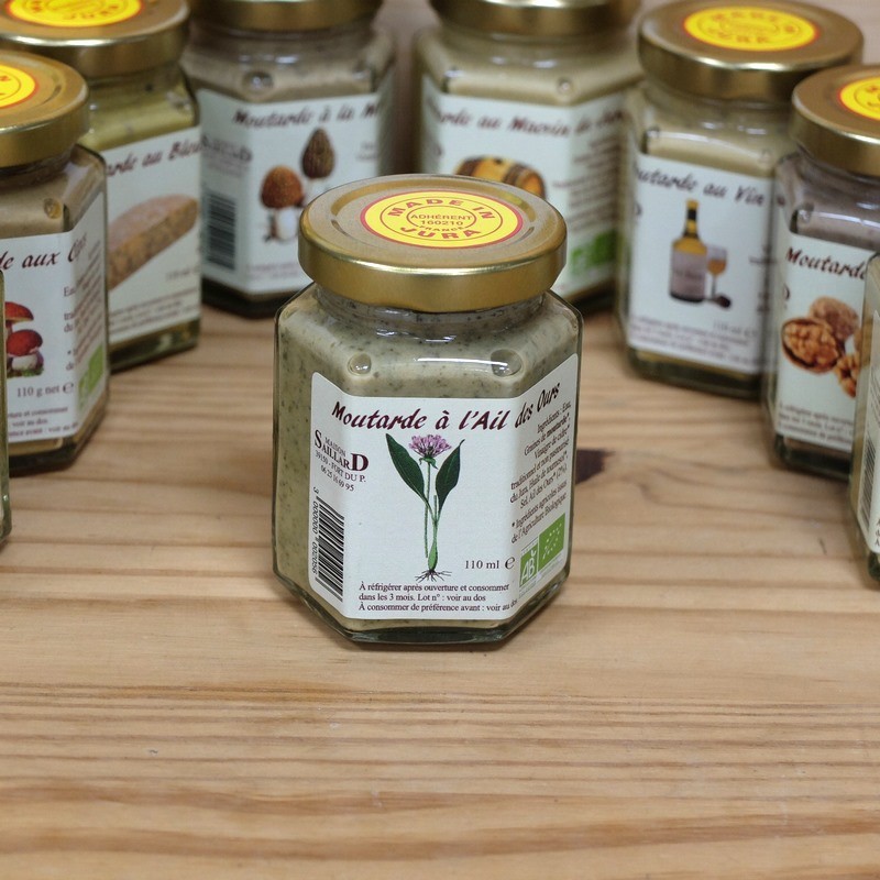 Ingrédients : eau, graines de moutarde*, vinaigre de cidre* traditionnel et non pasteurisé du Jura, huile de tournesol*, sel, ail des ours* 2%.